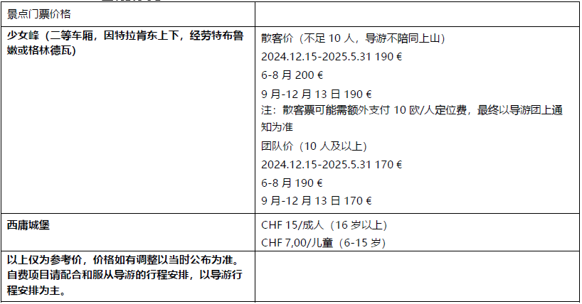 门票,午晚餐,自费项目,司机和领队的服务费共6欧/人/天(成人及小童同价),旅游保险,个人消费。