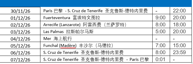第 8 天 特内里费 - 巴黎 下船后乘车到特内里费机场,早上10点55特内里费机场起飞,下午4点05到达巴黎奥利机场.费用明细